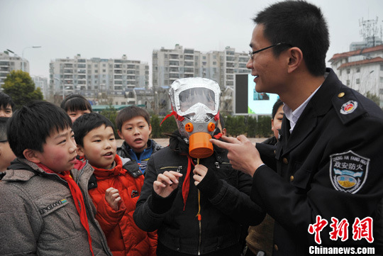 2月26日,民防宣传员为学生们普及民防应急知识。当日,安徽省合肥市翠竹园社区邀请民防宣传员为辖区的学生们普及民防应急自救与互救的基本技能、基本逃生手段和防护措施,以及后期处置等知识。中新社发 韩苏原 摄