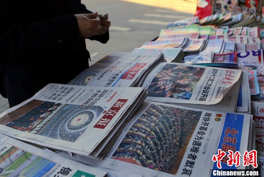 3月4日,一位北京市民在报摊购买当天报纸。当日,多家报纸的头版都报道了全国政协十二届二次会议开幕的消息。中新社发 李慧思 摄