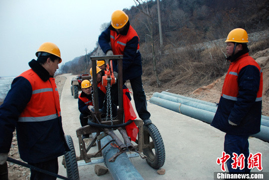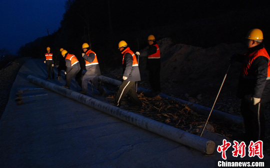 3月3日,沈阳供电段凤城电力车间职工将电杆运送到现场。中新社发 杨威 摄
