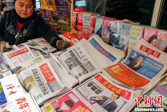 3月14日,北京一家报摊的老板正在摆放当日报纸,当日北京各大媒体的头版纷纷报道了李克强总理记者会的内容。中新社发 张浩 摄