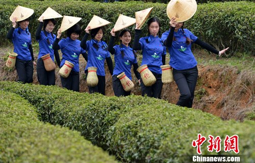 3月16日,采茶员工在福州宦溪恩顶高山生态茶园内载歌载舞,庆祝春茶开采。当天,以产销“茉莉花茶”著称的福建春伦集团,举行了新年春茶开采礼。中新社发 郑祚声 摄