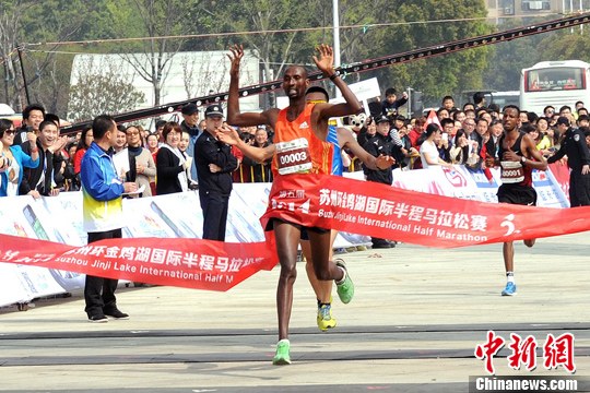埃塞俄比亚选手第一个撞线获得半程马拉松冠军。徐苏丹 摄