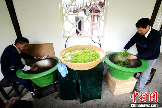 3月31日,苏州虎丘山风景区茶园内的茶农们正在采摘“云岩”新茶,并现场进行炒制,期间,迎面而来的茶香,沁人心脾。随着气温的回暖,苏州虎丘山风景区“云岩”新茶开始进入首轮采摘期。“云岩”茶前身为历史上享有盛誉的“白云茶”,几年前该景区引进了近万株与当年“白云茶”树种相同的茶树,栽种于景区约10亩茶园中。