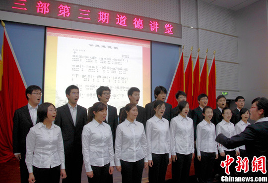 4月1日下午,中国航天科工集团公司第三研究院第三总体设计部在北京举办主题为“信仰与忠诚”的第三期“道德讲堂”,一批航天青年人才在讲堂上合唱《公民道德歌》。中新社发 孙自法 摄