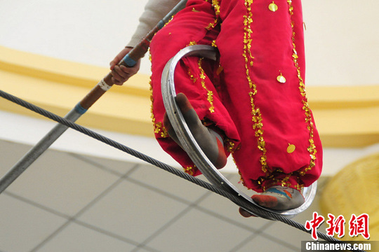 新疆小姑娘表演惊险“达瓦孜” 踩钢圈走钢丝(3)