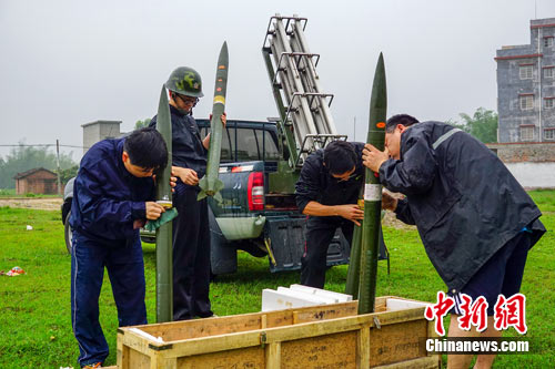 图为气象科技人员在实施作业前检查人工增雨火箭弹。中新社发 李斌喜 摄