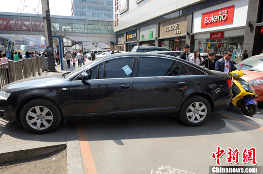 4月8日,内蒙古呼和浩特市中心,一车主把车停放在道路中间,严重影响过往车辆及行人通行。车窗上已被贴上罚单。中新社发 刘文华 摄