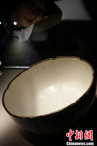 4月8日,香港苏富比2014春拍“艺海观涛:坂本五郎珍藏中国艺术——定窑”于香港会议展览中心举槌,逾四十年未公开展览的“克拉克旧藏定窑大盌”北宋定窑划花八棱大盌以4000万港元起拍,经多轮激烈竞价,最终以1.47亿港币成交。中新社发 杨可佳 摄