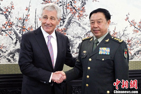 4月8日下午,中共中央军委副主席范长龙在北京八一大楼会见来访的美国国防部长哈格尔。中新社发 宋吉河 摄