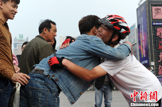 当日,内蒙古小伙那苏图抵达安徽合肥,开始了他“益行拥抱中国”的第48站行程。28岁的那苏图计划在1年半的时间内走完中国95个城市,总行程38789公里。在路上为“瓷娃娃”(脆骨病患者)征集万人拥抱,让市民消除对罕见病人的歧视。