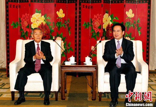 4月8日,国务院侨办副主任谭天星在北京会见了多米尼加华侨总会访问团一行。图为谭天星与多米尼加华侨总会冯赐权主席(左)。中新社发 张勤 摄