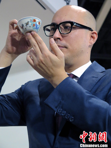 4月8日,在香港苏富比春拍上,玫茵堂珍藏明成化斗彩鸡缸杯以落槌价2.5亿元(港币,下同)、总成交价2.8124亿元拍出,刷新中国瓷器世界拍卖纪录。图为拍卖后,苏富比亚洲区副主席及中国瓷器及工艺品部国际主管仇国仕展示拍品。中新社发 贾思玉 摄