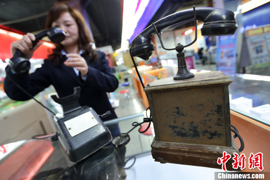 4月9日,工作人员将展出的民国初期的手摇电磁电话机(右)和上世纪五十年的手摇电话机(左)摆放整齐。中新社发 泱波 摄