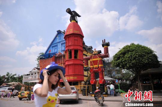 图为重庆洋人街竖立起了以灭火器的外形模拟建造的房屋。陈超 摄