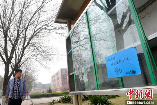 4月12日,在山西大学商务学院,由该校信息学院学生开设的诚信店铺货架已空,并张贴“盈利状况:-25元(2014年4月10日)”的提示。中新社发 韦亮 摄