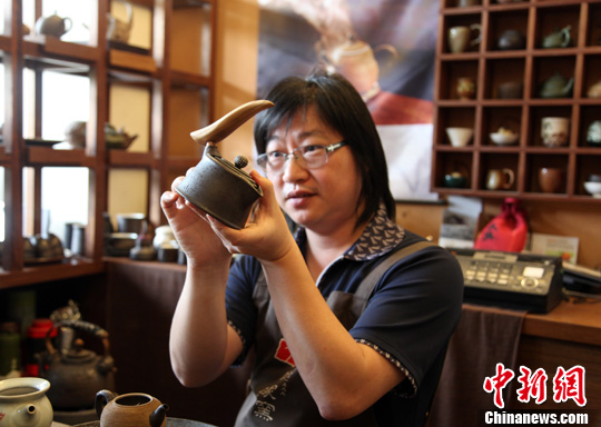 位于台中市大雅区的赵家窑,是台湾工艺之家之一。图为赵家窑的掌门人赵胜杰近日向记者介绍陶制茶壶之妙。中新社发 陈立宇 摄