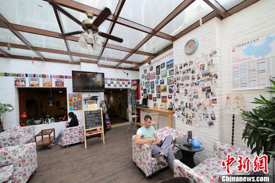 4月16日,背包客们在戈萨国际青年旅舍。近日,位于天津五大道核心区,该市首家受YHA认证的国际青年旅舍正式营业。中新社发 佟郁 摄