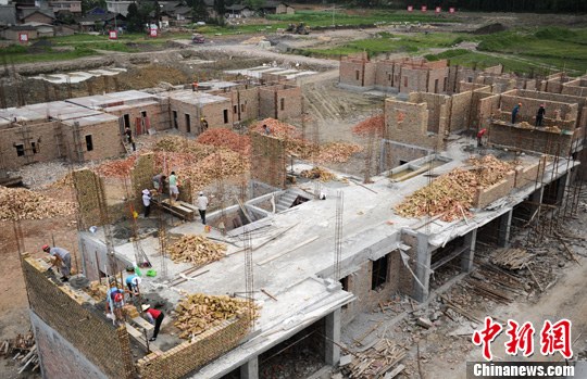 4月16日,芦山思延乡草坪村侨爱新村建设工地一片繁忙。中新社发 刘忠俊 摄