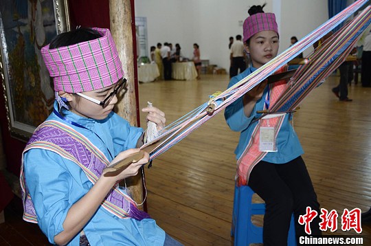 图为两名学生现场制作瑶族织锦。翟李强 摄