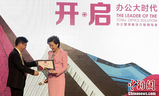 4月17日,杨澜在北京成为得力“办公形象大使”。杨澜还现场讲解了得力“办公大时代”整合办公产业链上下游各个环节的特点。中新社发 刘关关 摄