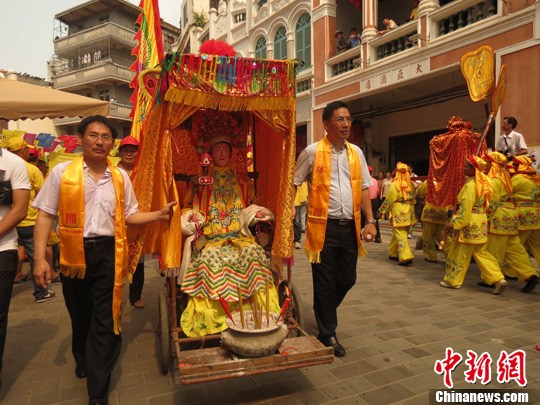 4月20日,海南各宫庙纪念妈祖诞辰1054周年祭典仪式在海口中山路骑楼老街举行,千余名妈祖信民盛装沿老街巡游。妈祖坐的金銮,由信众前后簇拥抬着,不是四平八稳,而是摇摇荡荡。据说,轿子荡得越厉害就越能保平安。中新社发 张茜翼 摄