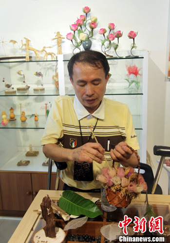 4月20日,追求再生之美的台湾树皮编织达人李永谟,在南投草屯的台湾工艺中心展技艺,宣介如何将资源环保再生,创造艺术之美。中新社发 陈立宇 摄