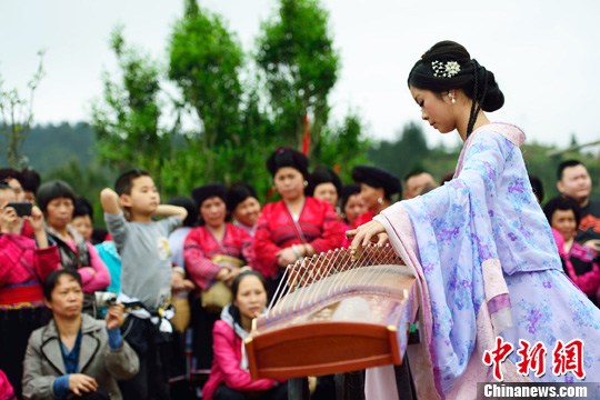 4月20日,红瑶姑娘在广西龙胜龙脊古茶树祭祀仪式活动上演奏古筝。中新社发 石农兵 摄