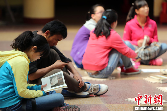 4月22日,山西太原山西财经大学图书馆内,学生们正在互相交流读书感悟。中新社发 张云 摄