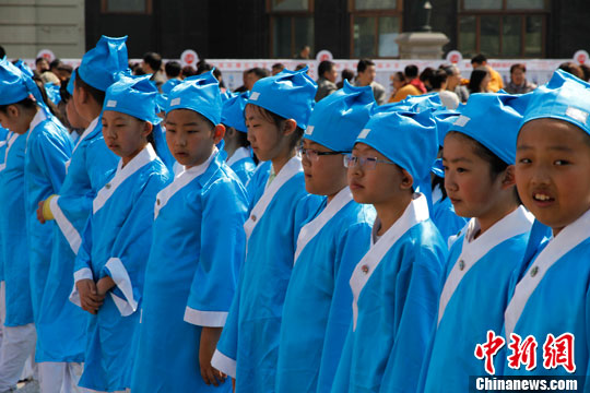 哈尔滨举行全民阅读活动 小学生着传统服饰参加