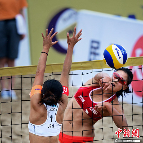 4月24日,由中国女子沙排队中的“一姐”福州姑娘薛晨和史上最年轻的世锦赛冠军选手97年出生的夏欣怡组合,在福州公开赛的首场比赛中中国队(红色)以0:2不敌日本队。张斌 摄