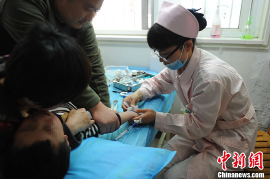 4月25日,安徽省立儿童医院护士在给手足口病患儿扎针,医院病房患病儿也日渐增多。中新社发 张娅子 摄