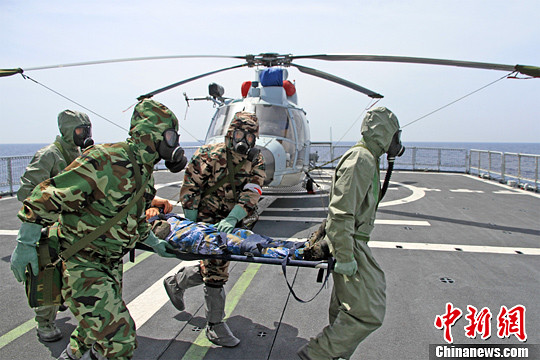 图为结合护航任务,黄山舰开展化武医疗救护实战化检验。中新社发 徐广 摄