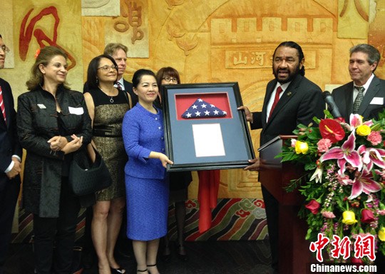 当地时间4月25日晚,中国驻休斯敦总领馆举行许尔文总领事离任招待会,当地政要和侨学界代表近四百人出席,送别上任两年零八个月的许尔文总领事。图为得克萨斯州联邦众议院艾尔·格林(右二)向许尔文赠送贺状和礼物。中新社发 王欢 摄