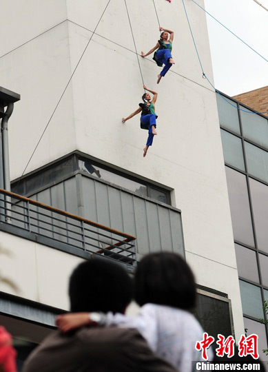 4月26日,湖北武汉,2014中法文化之春艺术节武汉上演《垂直环境日双人舞》舞蹈表演秀,来自法国Retouramont舞团舞蹈演员身怀绝技,竟能在大楼的墙壁上翩翩起舞,果然是新一代的“蜘蛛侠”,让武汉的观众大开眼界。