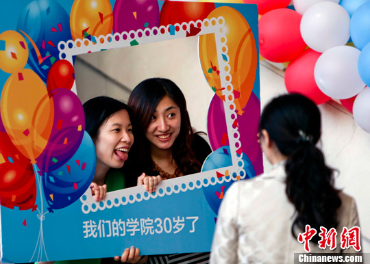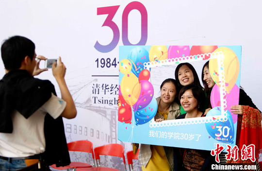 4月26日,在清华大学经管学院内,来自各地的历届校友纷纷返校,大家欢聚一堂庆贺学院建院30周年。中新社发 陆欣 摄