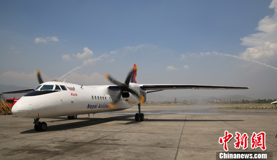 这是中国按照协议向尼泊尔交付的首架国产飞机,也是尼泊尔航空公司28年来首次迎来新飞机。此前两国签署购买飞机协议,中方向尼泊尔提供两架新舟60和4架运12E国产飞机,以支持尼泊尔民航和旅游业发展。图为中国交付尼泊尔首架国产新舟60客机飞抵加德满都特里布万机场。中新社发 符永康 摄