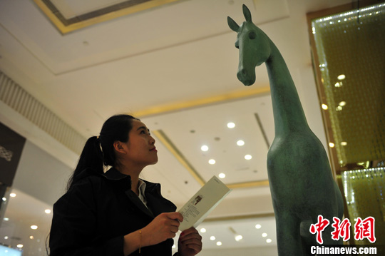 4月27日,市民在雕像前留影。当日,“邂逅---马语者”在沈阳盾安新一城展出。中新社发 于海洋 摄