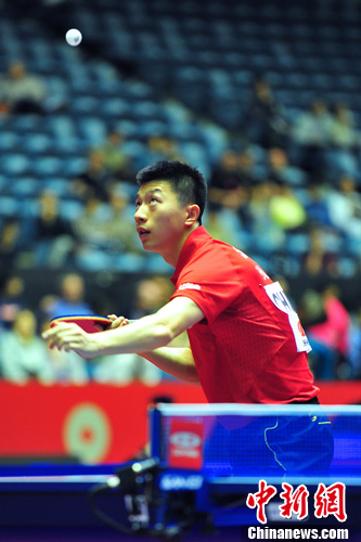 4月28日,2014东京世界乒乓球团体锦标赛拉开战幕,中国男队在当天的小组赛首战中以3比0战胜巴西队,取得开门红。图为马龙在比赛中。中新社发 高越 摄