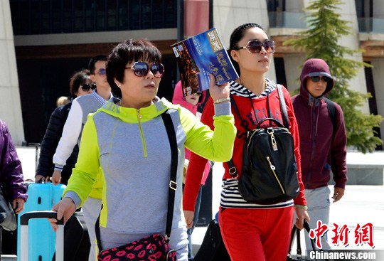 4月27日,手持《西藏旅游》杂志的游客步出拉萨火车站。随着“五一”小长假的临近,来自世界各地的游客在拉萨街头随处可见,尽享高原古城的独特魅力。中新社发 李林 摄