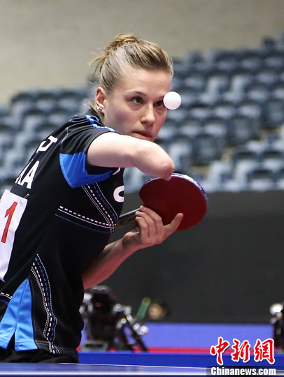 图为4月28日,波兰队素有“乒坛维纳斯”之称的独臂高手帕蒂卡在与中国队的比赛中。中新社发 高越 摄
