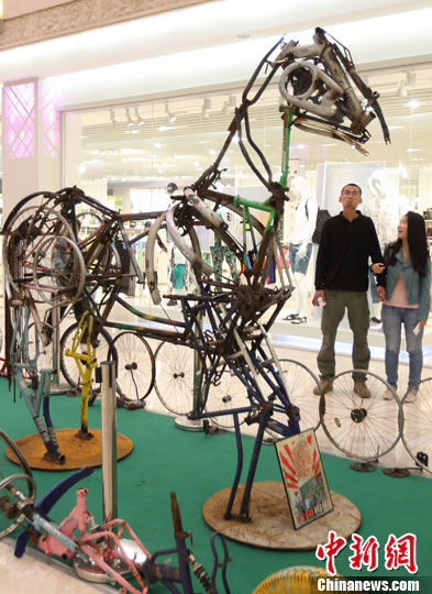 图为4月28日晚,市民被用废弃自行车零件组成的马吸引。中新社发 泱波 摄