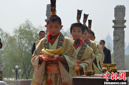 4月30日,农历四月初二,是孟母诞辰之日,兰州国学研究会等6家机构举办公益活动“保护母亲河,共同献爱心”,小学生们身着古装,手捧水果、鲜花,面向黄河以“三拜九叩”的方式祭奠黄河母亲。