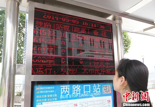 5月5日,重庆首批智能电子站牌正式上岗,采用LED电子显示。两路口公交车站的显示屏上不断更新着各条过站公交车的数据,市民可以实时了解自己要坐的下一趟车的到达时间。目前,首批公交电子站牌共投放了17块显示屏。中新社发 周毅 摄