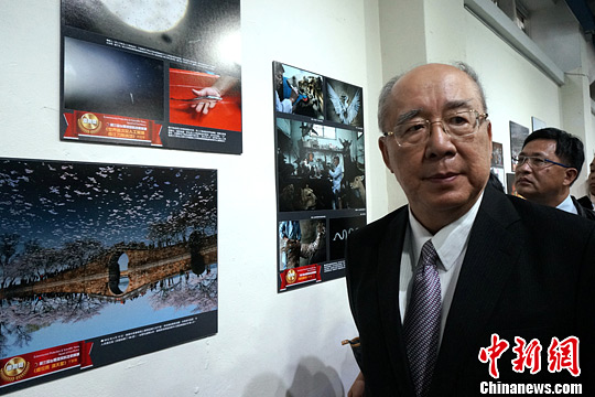 5月5日,“台海新闻摄影大赛”获奖作品展在台北举行,中国国民党荣誉主席吴伯雄到场参观。中新社发 李志全 摄