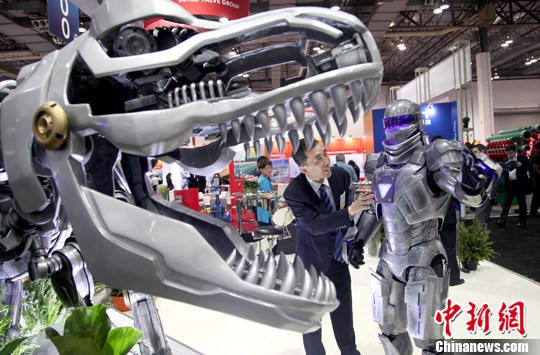 当地时间5月5日,生产硬质合金耐磨精密零部件的中国湖南民营企业凭借霸气十足的金属恐龙和“钢铁侠”,成为国际海洋油气技术大会上的“人气王”。当天,第45届休斯敦国际海洋油气技术大会(OTC)在美国“能源之都”休斯敦瑞赖安公园揭幕。中新社发 王欢 摄