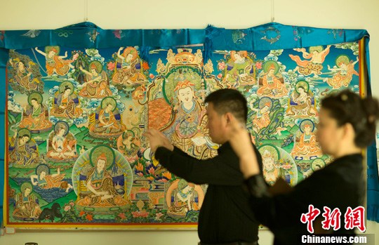 5月6日,参观者在精美的唐卡前拍照留念。当日,为期十天的藏记热贡唐卡艺术展在北京文龙堂美术馆开幕。此次展览的热贡唐卡均为角巴加三兄弟共同协作完成的作品。中新社发 盛佳鹏 摄