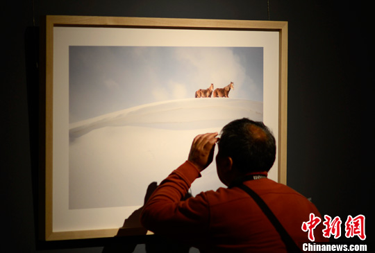 5月6日,观众在雪原·马摄影作品前驻足。当日,由中国艺术摄影学会主办的《雪中的自在》——李刚《雪原·马》系列摄影作品展在中国美术馆开展。中新社发 廖攀 摄