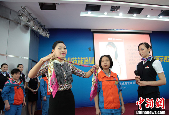 在空乘专业教师的讲解中,十名身着空姐制服的大学生志愿者现场为戒毒学员演示了社交礼仪中的十种常用丝巾系法。同时,该院形象设计专业的两名大学生也为戒毒学员进行了职业妆、舞台妆等多种场所化妆的技巧。图为大学生正在为戒毒人员演示社交礼仪中的十种常用丝巾系法。