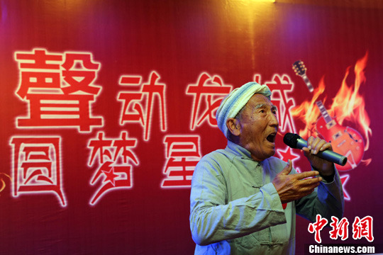 5月11日,山西太原,85岁老者张裕勤在舞台上演唱陕北民歌《羊肚肚手巾三道道蓝》,旨在希望通过选秀来一圆自己踏上舞台的明星梦。中新社发 张云 摄