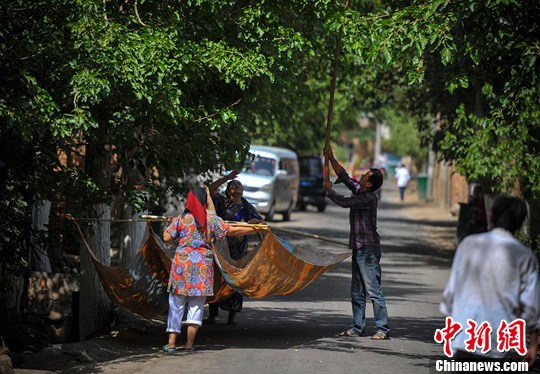 5月11日,新疆吐鲁番葡萄沟里的维吾尔民众在巨大伞状的桑树下,两人撑起一块大布单,一人用手持长四五米的杆子,伸到树间成熟的桑葚最多的地方轻轻摇晃枝干,已经成熟的桑葚就劈劈啪啪地落到了布单上。刘新 摄
